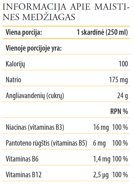 *Referencinė maistinė vertė. (Referencinis vidutinio suaugusio asmens vartojimo kiekis 8400 kJ/2000 kcal).